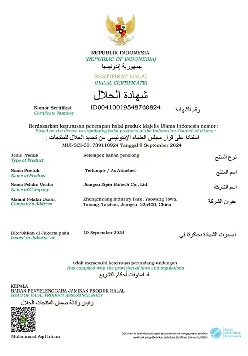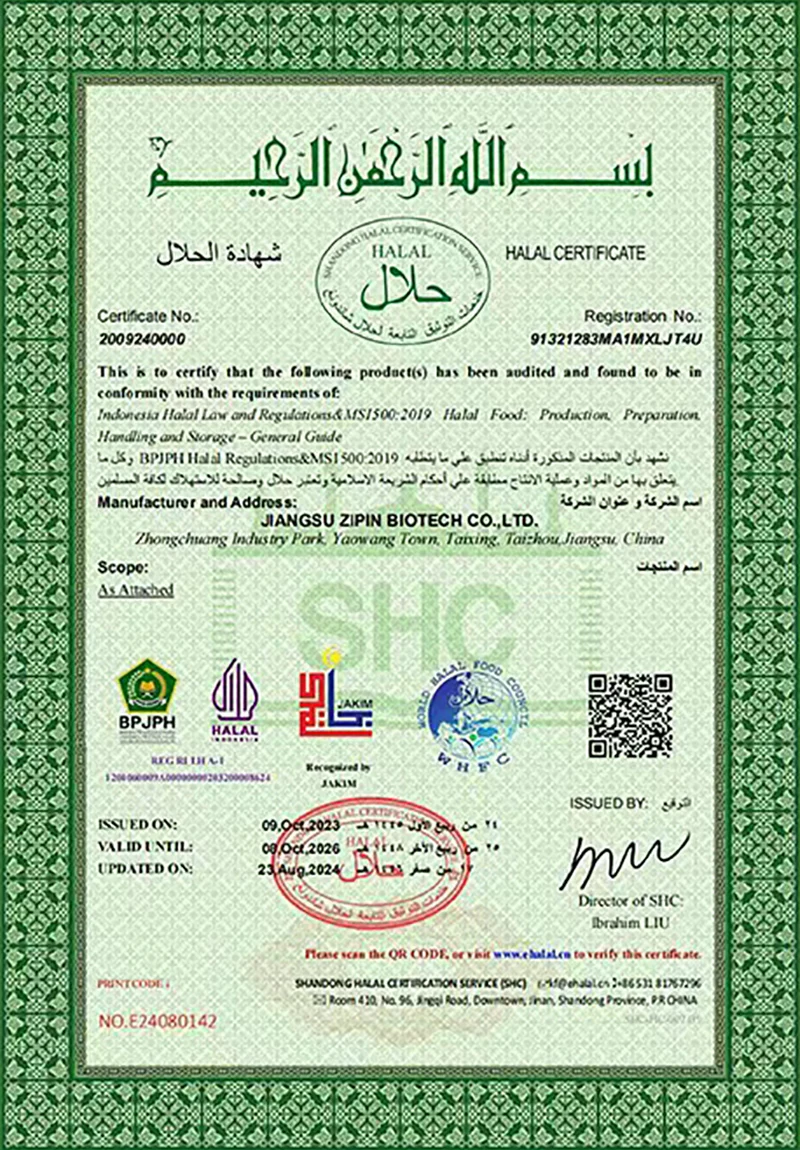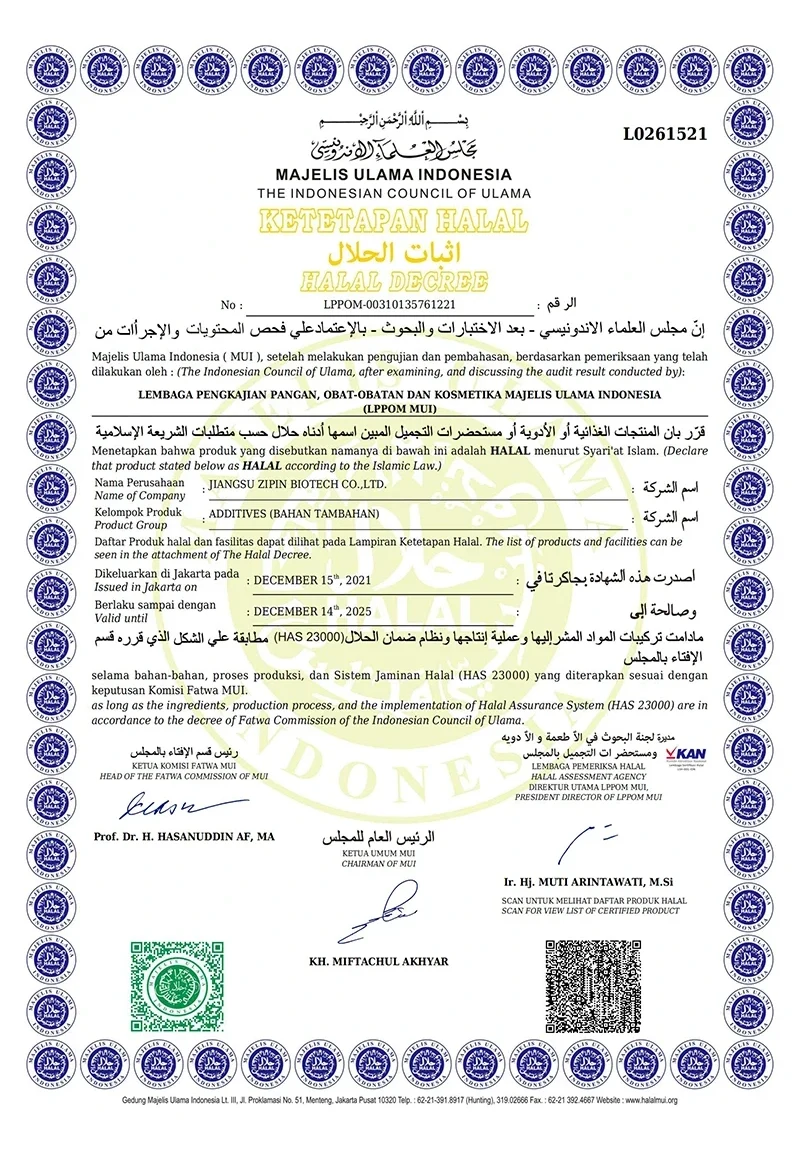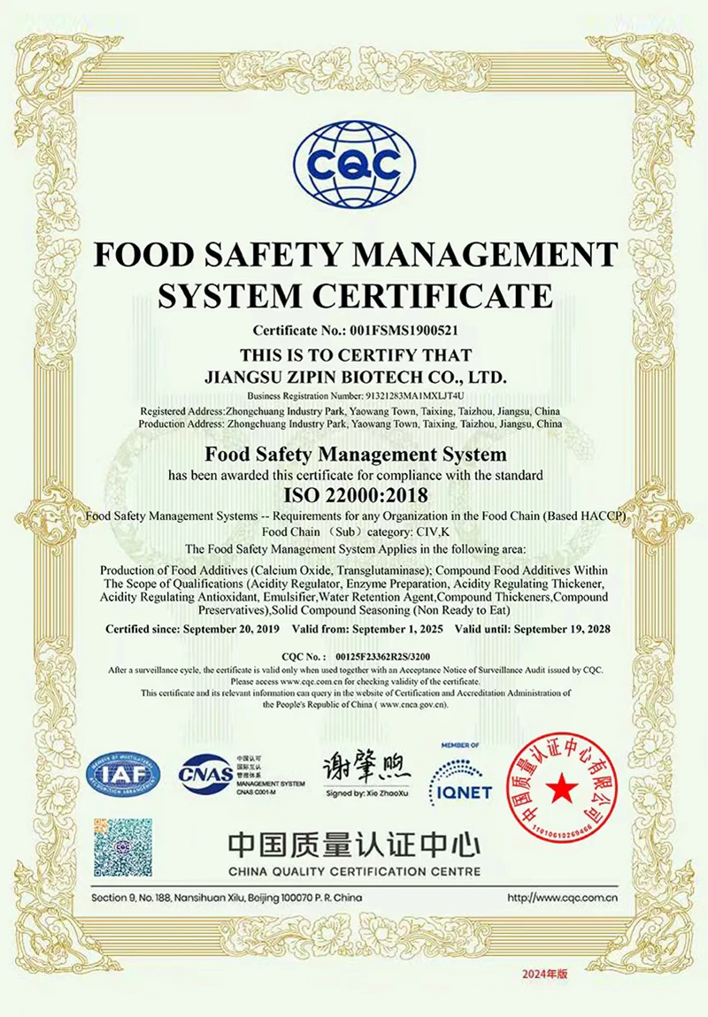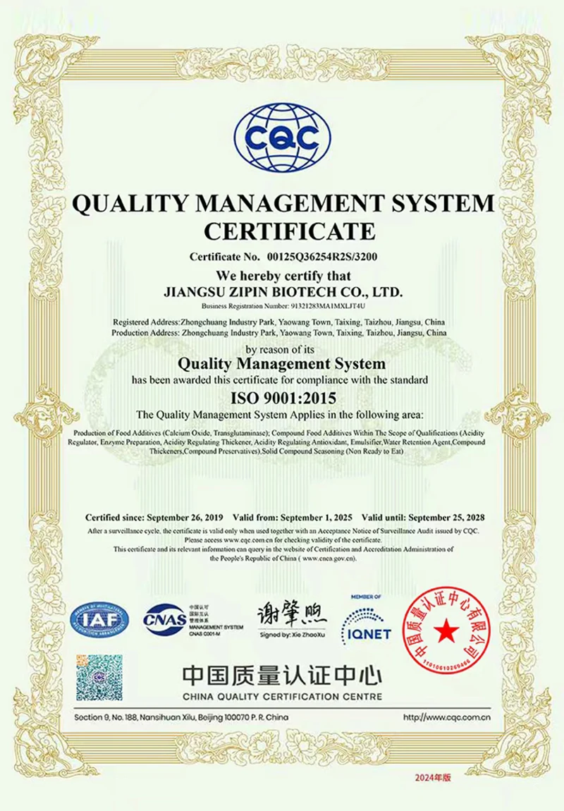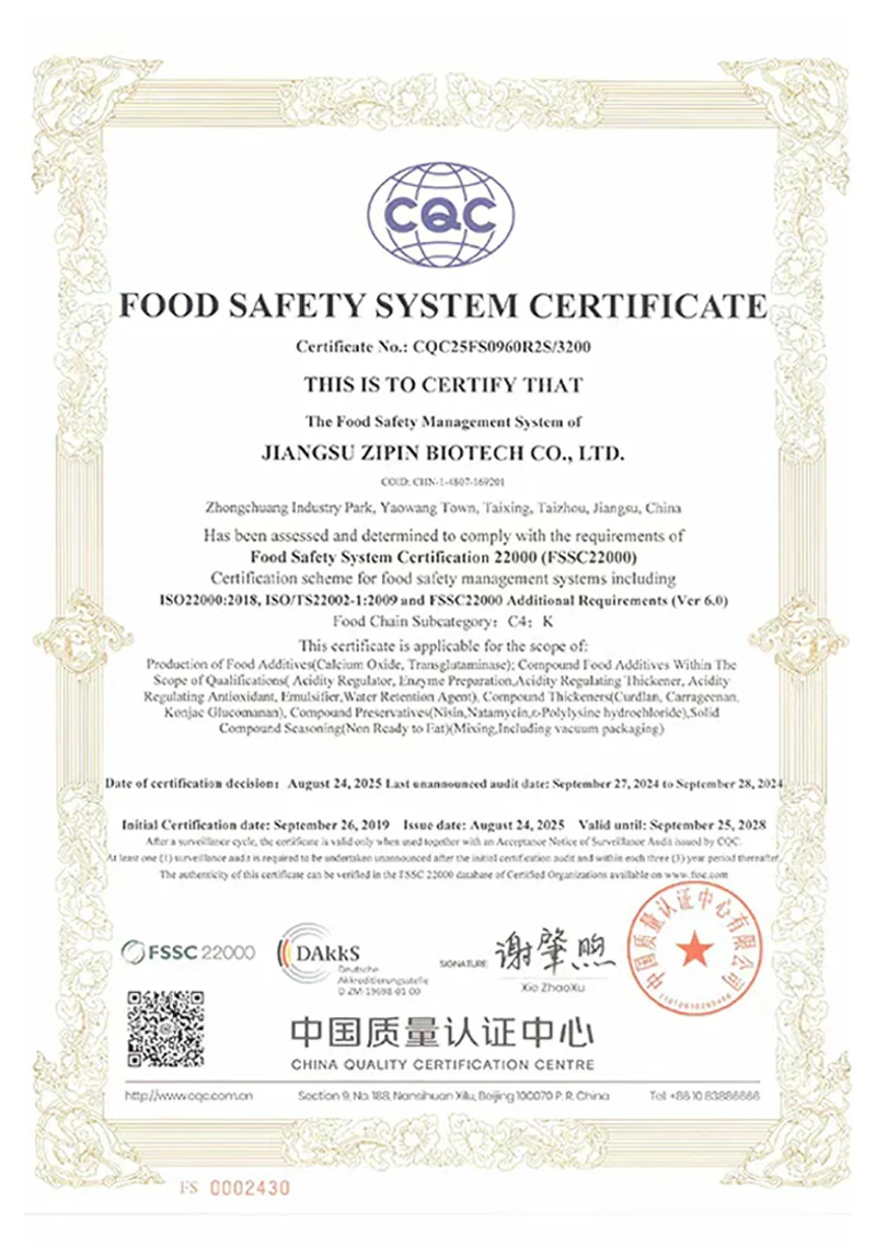 Jiangsu Zipin Biotech Co., Ltd. wurde 2016 gegründet und erstreckt sich über eine Fläche von 20.000㎡. Als modernes Privatunternehmen beschäftigen wir uns heute hauptsächlich mit der Forschung und Entwicklung sowie der Produktion und dem Verkauf von Lebensmittelzusatzstoffen. Unsere Hauptprodukte sindTransglutaminase, Curdlan, ε-polylysine, Nisin, Natamycin und andere Lebensmittelzusatzstoffe.